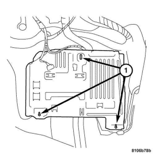 1. Connect the TCM harness connectors and attach the TCM (2) to the base plate with the two retaining screws (1).