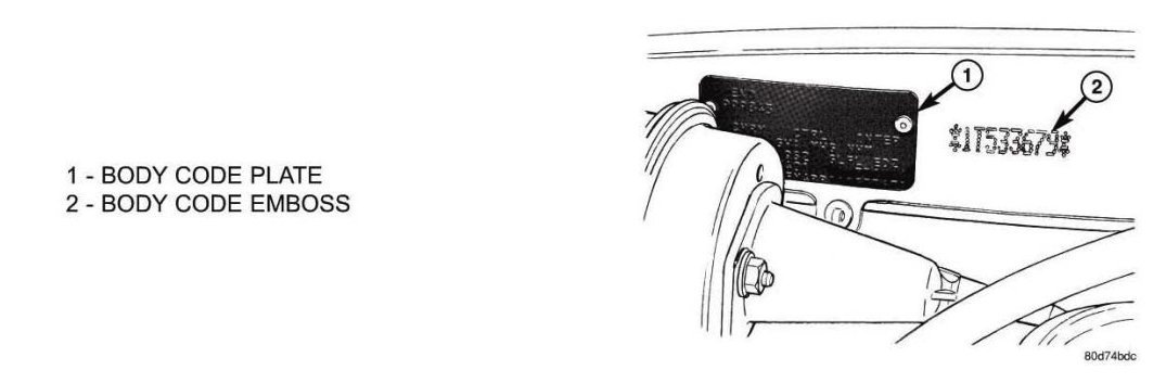 The Body Code Plate is located in the engine compartment on the plenum behind the right side strut tower. There are seven lines of information on the body code plate. Lines 4, 5, 6 and 7 are not used to define service information. Information reads from left to right, starting with line 3 in the center of the plate to line 1 at the bottom of the plate.