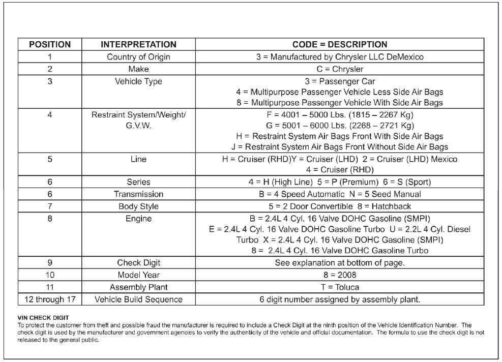 Vehicle Identification Number Decoding Chart