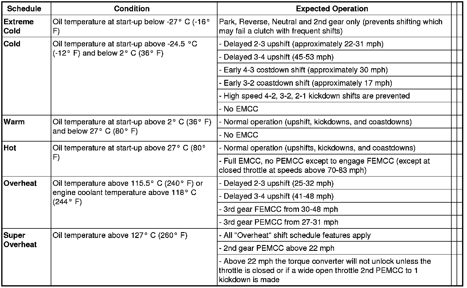 As driving conditions change, the PCM appropriately adjusts the shift schedule. Refer to the following chart to determine the appropriate operation expected, depending on driving conditions.