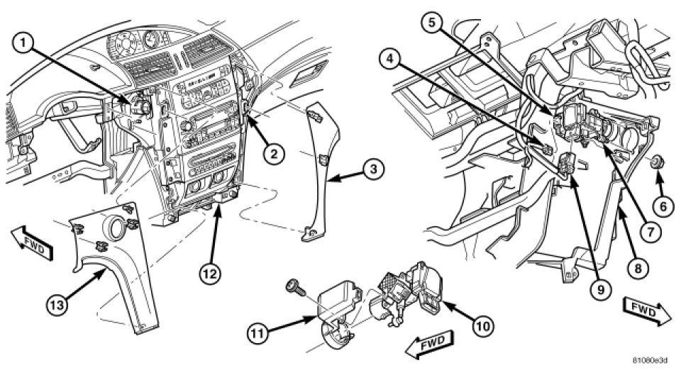 6. Position the instrument panel center stack left bezel (13) over retaining slots and firmly snap into place.
