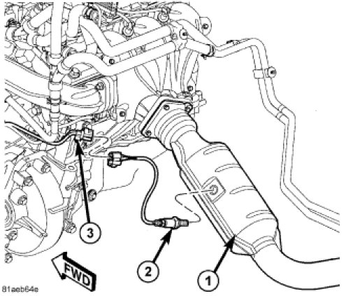 1. Install the O2 sensor (3) to the catalytic converter (2). Tighten to 41 Nm (30 ft. lbs.).