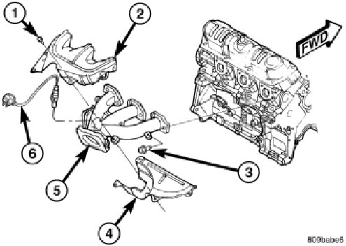 1. Position exhaust manifold (5) on cylinder head and install bolts to center runner (cylinder #3) and initial tighten to 2.8 Nm (25 in. lbs.).