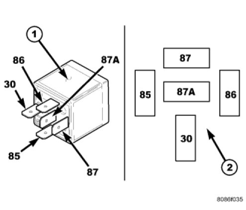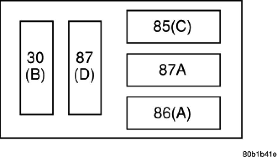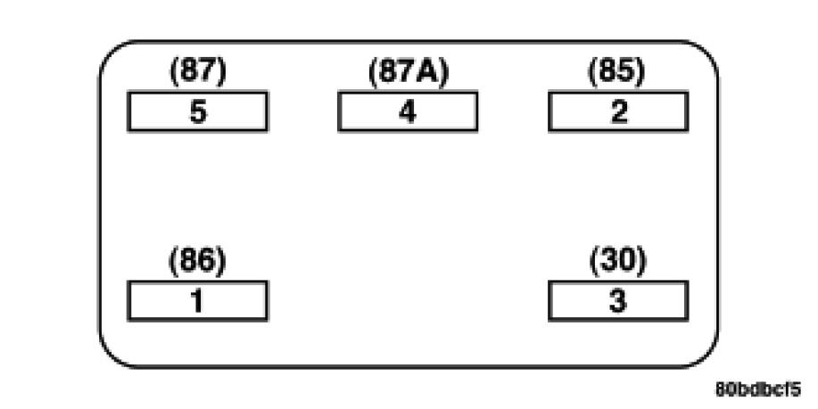1. A relay in the de-energized position should have continuity between terminals 87A and 30, and no continuity between terminals 87 and 30. If OK, go to STEP 2. If not OK, replace the faulty relay.