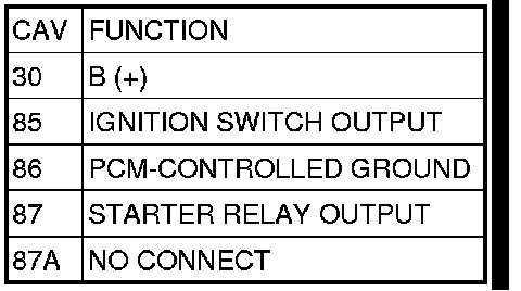 5. The coil ground terminal (86) is connected to the electromagnet in the relay. It is grounded by the PCM if the conditions are right to start the car. For automatic trans. cars the PCM must see Park Neutral switch low and near zero engine speed (rpm). For manual trans. cars the PCM only needs to see near zero engine speed (rpm) and low clutch interlock input and see near zero engine speed (rpm). Check for continuity to ground while the ignition switch is in the start position and if equipped the clutch pedal depressed. If not OK and the vehicle has an automatic trans. verify Park Neutral switch operation. If that checks OK check for continuity between PCM and the terminal 86. Repair open circuit as required. Also check the clutch interlock switch operation if equipped with a manual transmission. If OK, the PCM may be defective.