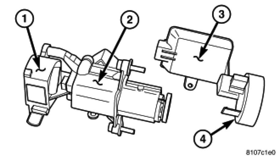 The SKREEM/WCM is located on and around (antenna ring) (4) the ignition key cylinder (2) along with the ignition switch (1). It is accessible only from behind the instrument panel, to the left of the steering column. Serviceability requires lock cylinder removal to access the complete unit.