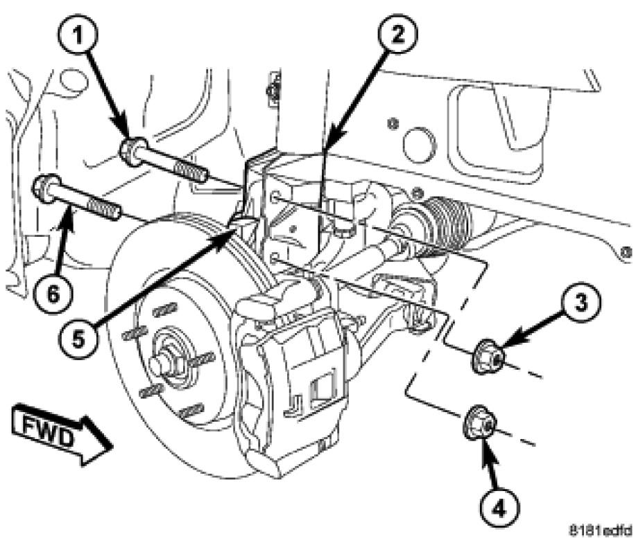 10. Separate the knuckle (5) from the strut clevis bracket (2) and position knuckle so it is out of the way of the strut. Use care not to overextend the brake flex hose or axle half shaft.