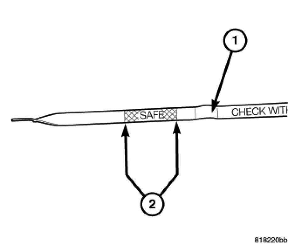 Checking the oil while the vehicle is on level ground will improve the accuracy of the oil level reading. Remove dipstick (1), and observe oil level. Add oil only when the level is at or below the SAFE mark. If the oil level is in the safe (2) range, do not add oil.