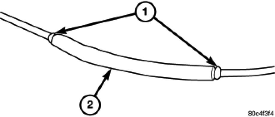 6. Center the heat shrink tubing (2) over the joint and heat using a heat gun. Heat the joint until the tubing is tightly sealed and sealant (1) comes out of both ends of the tubing.