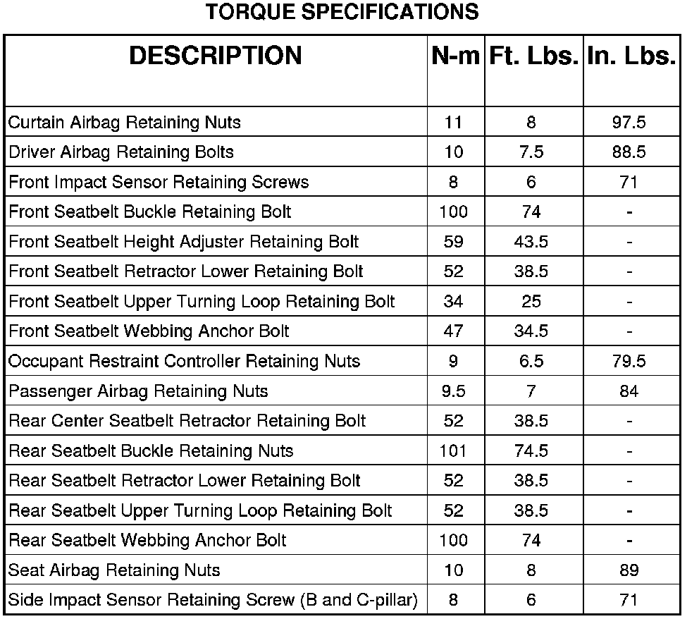 RESTRAINTS - TORQUE SPECIFICATIONS