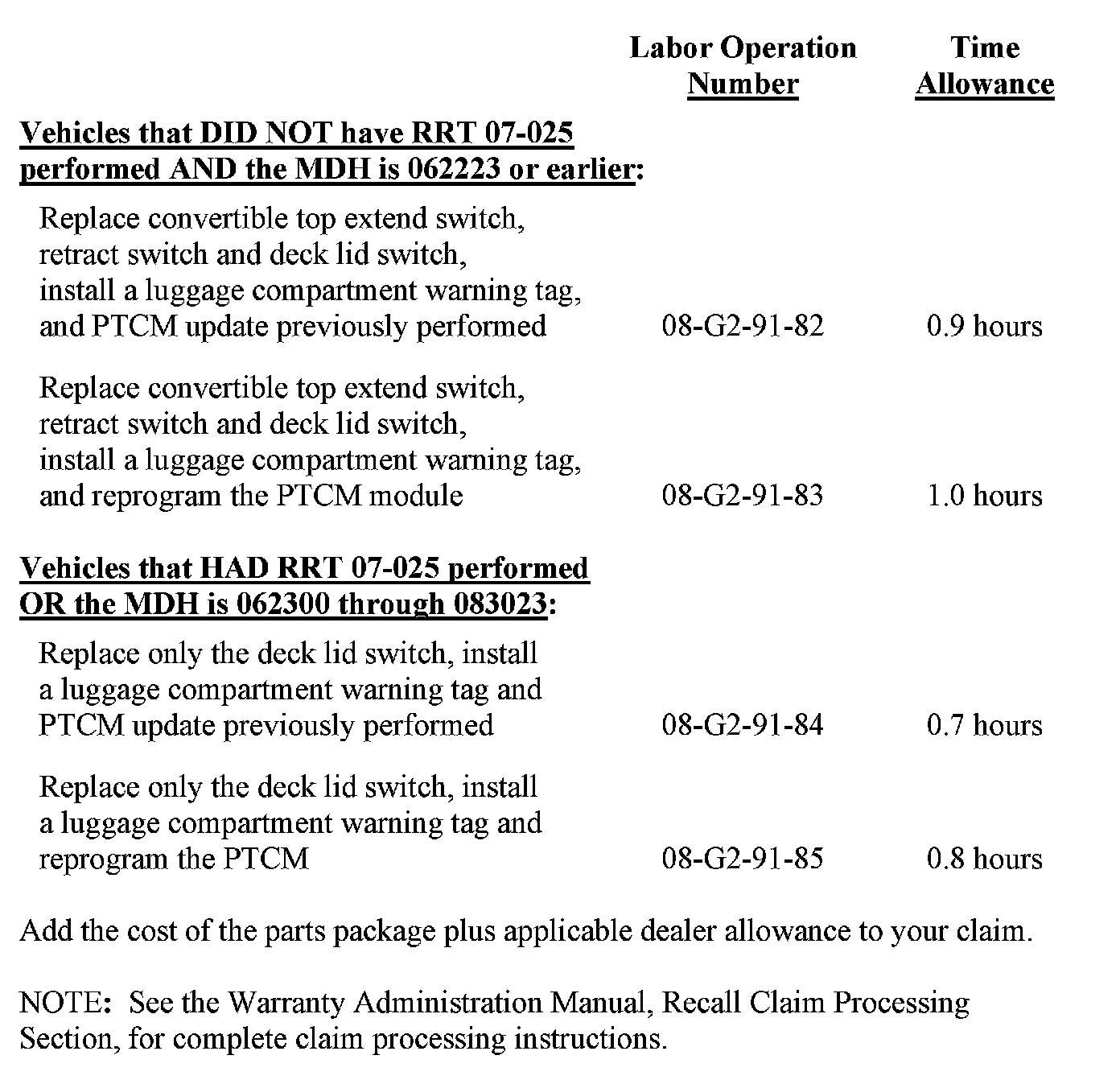 > If the vehicle HAD RRT 07-025 performed, OR the MDH is 062300 through 083023, only the deck lid forward latch micro switch must be replaced, the PTCM must be reprogrammed and a luggage compartment warning tag must be installed.