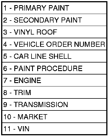 There are seven lines of information on the body code plate. Lines 4, 5, 6, and 7 are not used to define service information. Information reads from left to right, starting with line 3 in the center of the plate to line 1 at the bottom of the plate.