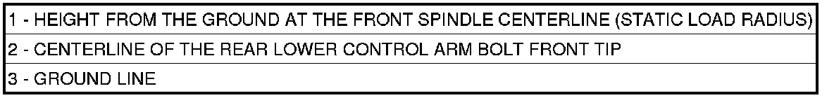 b. Center of the front face of bolt on the rear leg of Lower control arm (2) to ground vertical distance (3).