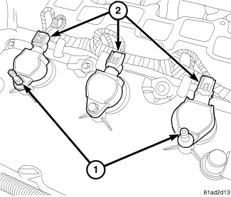 4. Install engine cover studs (1) in the two outside ignition coils on the front of the engine. Install bolts on the other ignition coils.