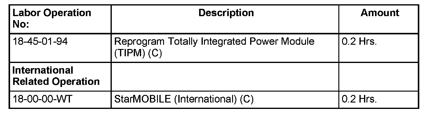 If the customer states that the remote start is inoperative. First check for codes if Diagnostic Trouble Codes (DTCs) are present, record them on the repair order and repair as necessary before proceeding further with this bulletin. If the Remote Start Inhibit DTC "Power Loss" is present in the TIPM then the TIPM must be flash reprogrammed with new software.