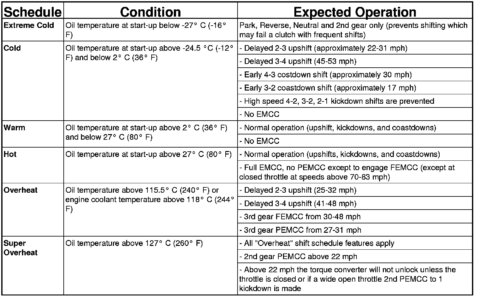 As driving conditions change, the PCM appropriately adjusts the shift schedule. Refer to the following chart to determine the appropriate operation expected, depending on driving conditions.