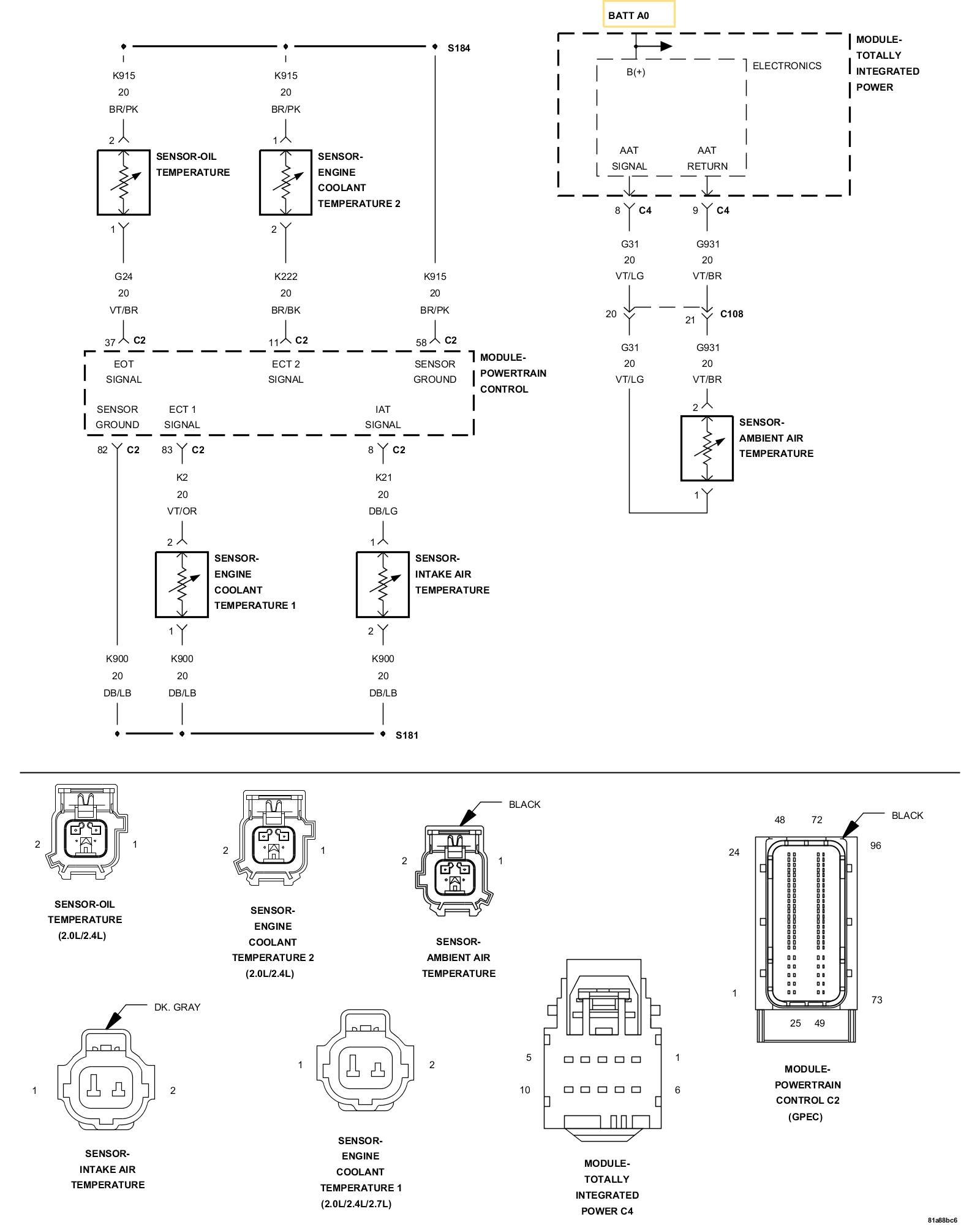1. Using the wiring diagram/schematic as a guide, inspect the wiring and connectors between the Engine Coolant Temperature Sensor and the Powertrain Control Module (PCM).