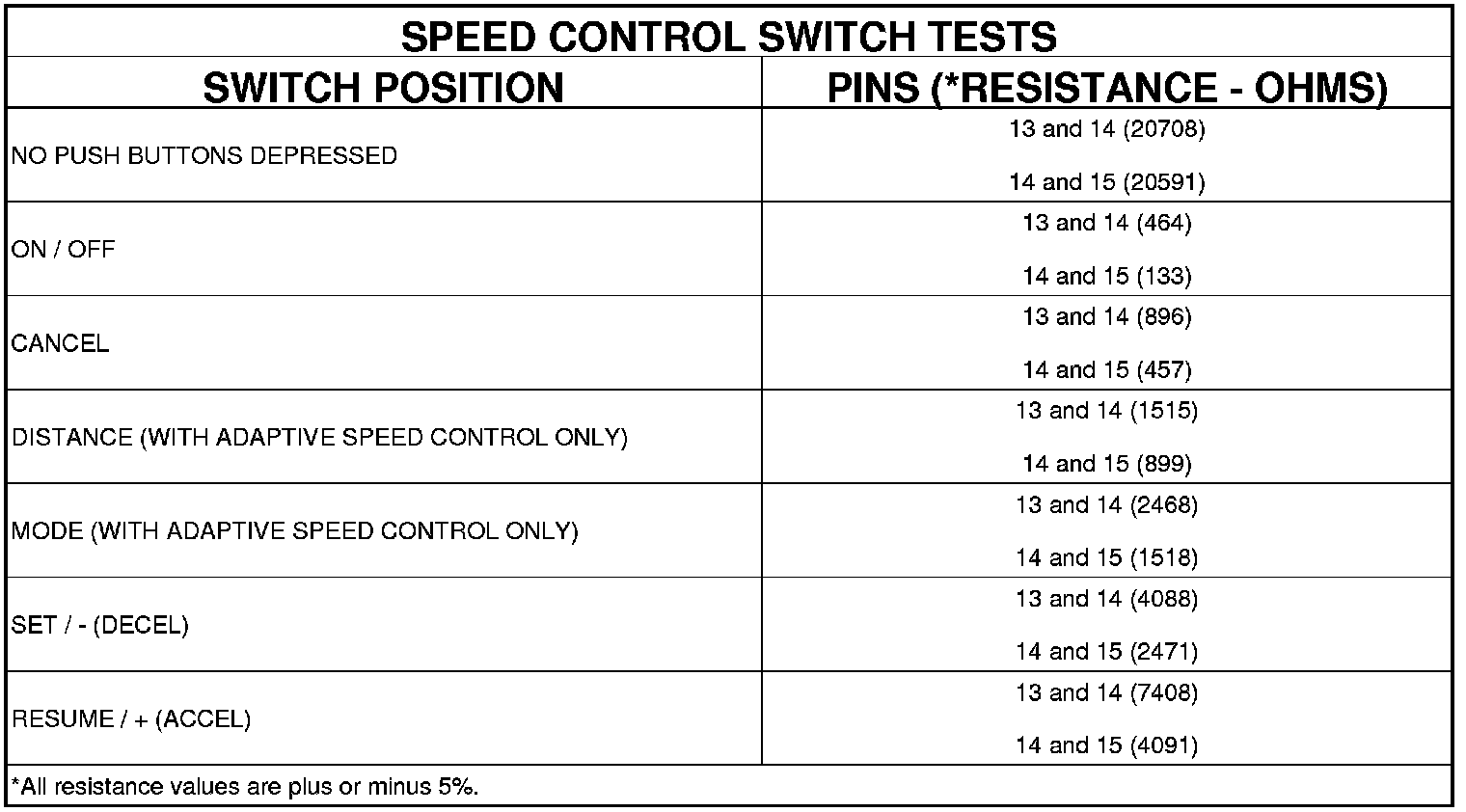 3. Using an ohmmeter, test the resistance between the terminals of the switch as shown in the Speed Control Switch Tests table.