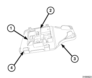 A humidity sensor (1) is used on Automatic Temperature Control (ATC) models to detect humidity levels inside the vehicle to optimize the dehumidifying effect of the A/C system. The humidity sensor is attached to a plastic bracket (3) by a metal retaining clip (2). The sensor bracket is attached to the inside of the windshield by an adhesive. A cover is attached to the sensor bracket by four plastic tabs (4). The humidity sensor is connected to the Body Control Module (BCM) by a dedicated three wire lead and connector that protrudes out from under the front of the headliner.