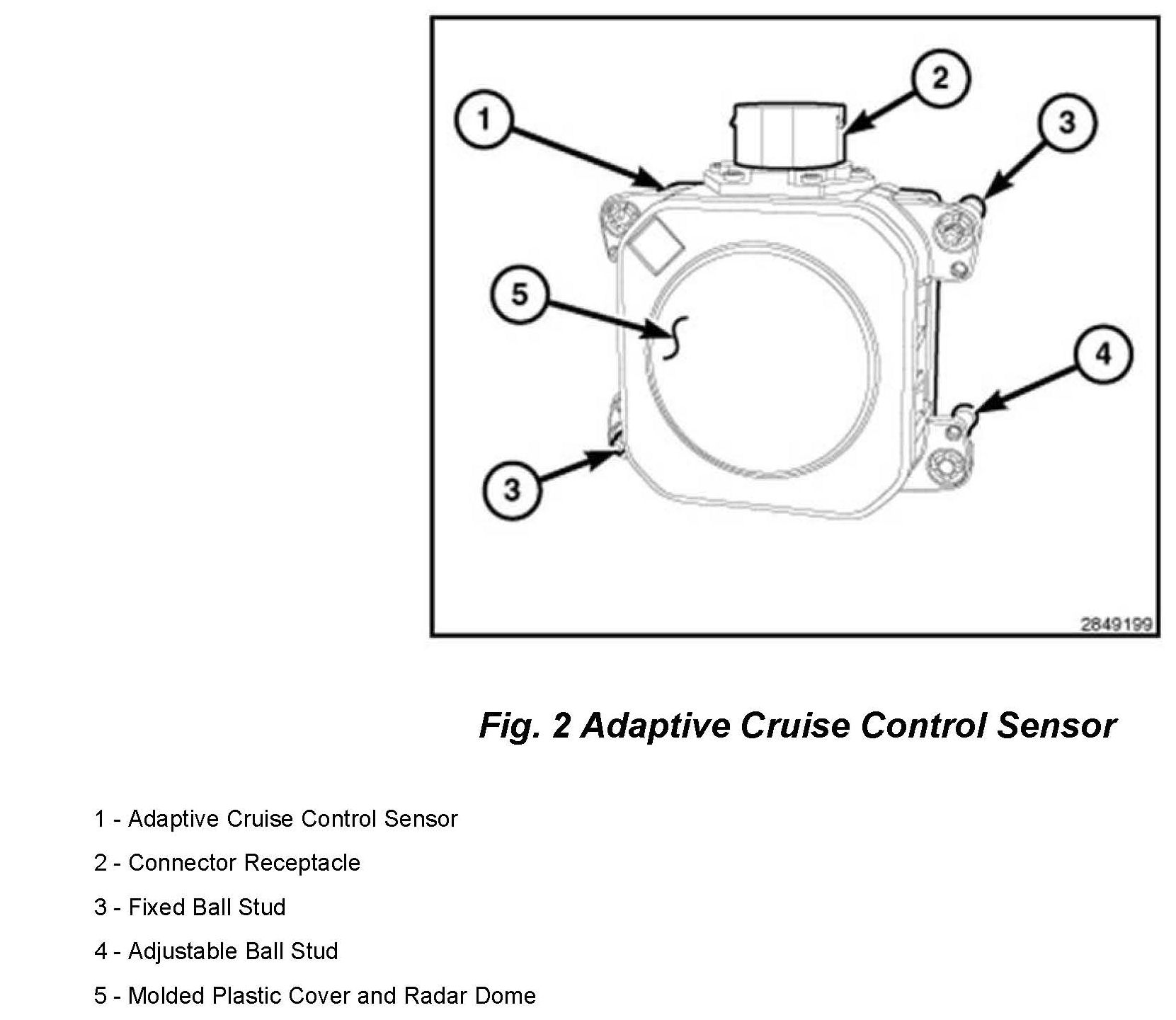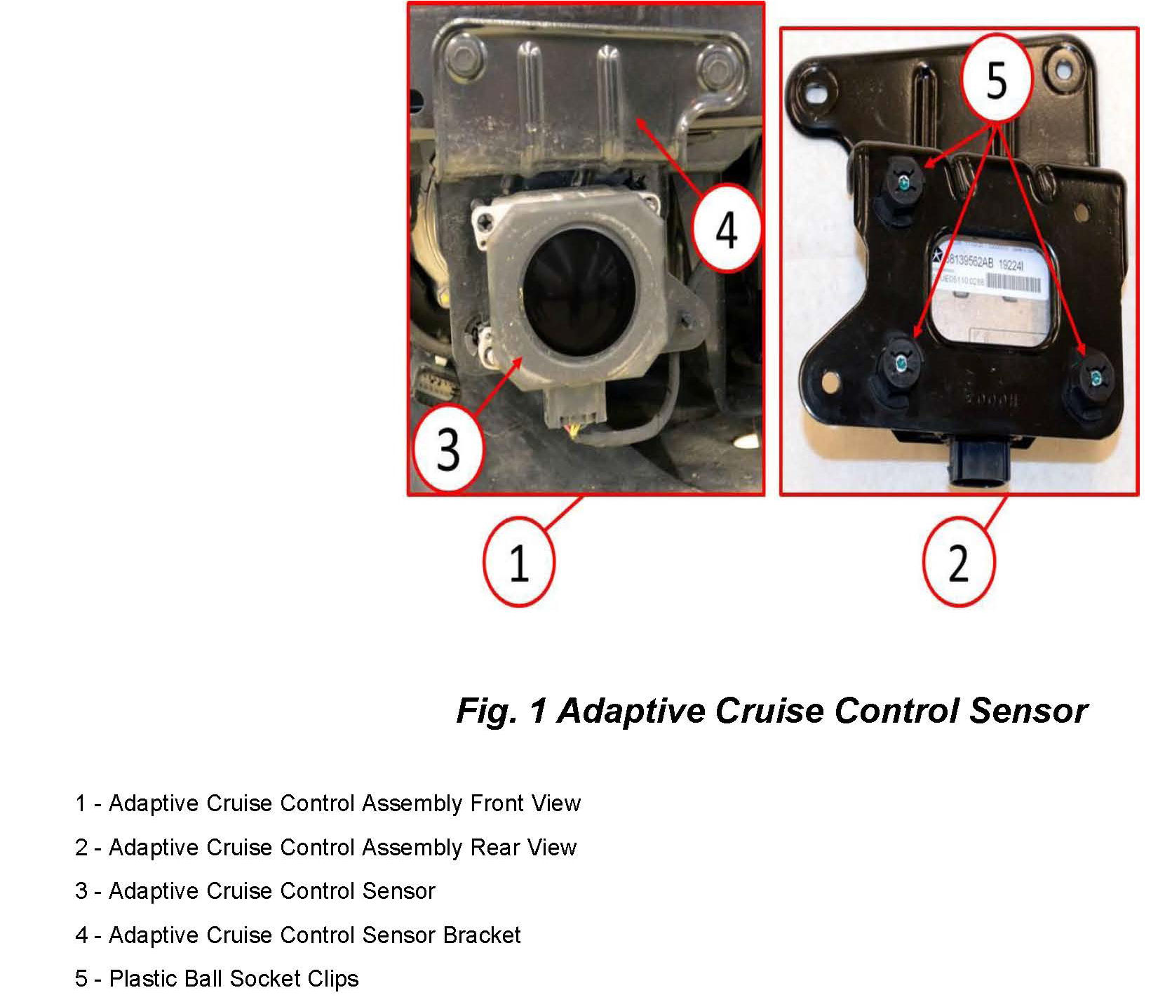 One fixed ball stud (4) and two adjustable ball studs (3) secure the sensor housing through a snap fit into three molded plastic ball socket clips installed in the mounting bracket (Fig. 2). The sensor pivots on the fixed ball stud while the two adjustable ball studs allow the sensor to be vertically aligned after installation using the ACC vertical alignment special tool and a 3.5 millimeter hex nut driver special tool (Miller Special Tools # 10243).