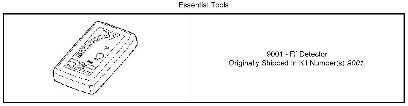 Using special tool (9001), first test to ensure that the transmitter is functioning. Typical testing distance is 2.5 centimeters (1 inch) for Asian transmitters and 30.5 centimeters (12 inches) for all others, press any transmitter button, then test each button individually. The tool will beep if a radio signal strength that lights five or more LED's is detected. Repeat this test three times. If transmitter fails any of the test refer to the Diagnostic Procedures.