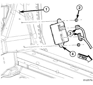 1. Position the Power Top Control Module (PTCM) (4) onto the mounting studs of the lower left quarter panel (1).
