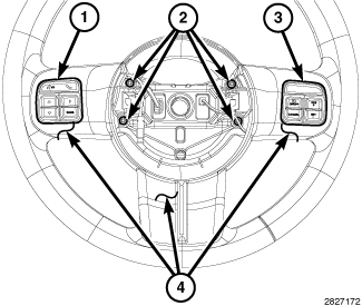 4. Position the front spoke bezel (4), EVIC switch pod (1) and speed control switch pod (3) as a unit to the steering wheel. Be certain that the steering wheel wire harness is routed between the lower or upper bezel stanchions and the inside circumference of the steering wheel hub cavity so that the wiring will not be pinched when the driver airbag is reinstalled.