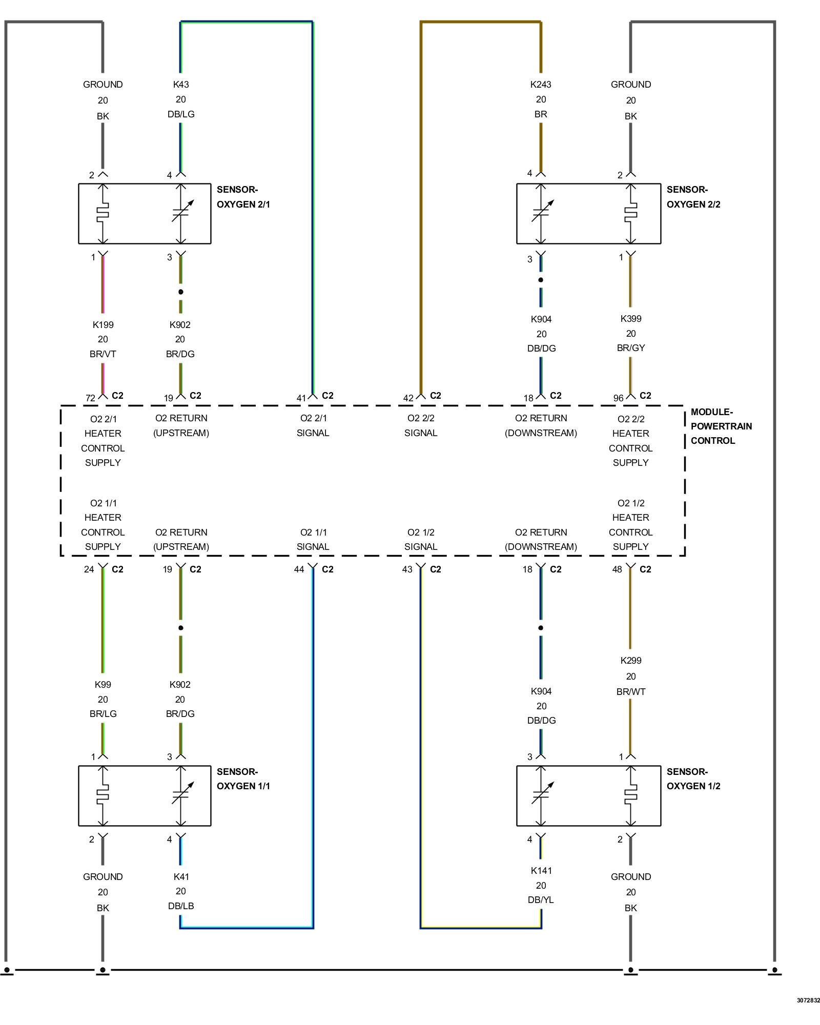1. Using the wiring diagram/schematic as a guide, inspect the wiring and connectors between the O2 Sensor and the PCM.