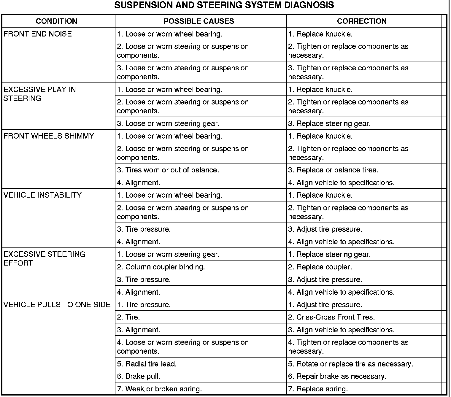 Before starting wheel alignment, the following inspection and necessary corrections must be completed. Refer to Suspension and Steering System Diagnosis Chart below for additional information.