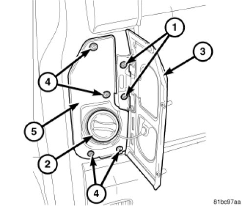 14. Install the Fuel Filler Tube Panel (2) and install the 4 Fuel Filler Tube Panel Fasteners (4).