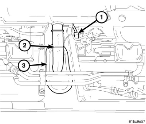 6. Reconnect the Evaporative Emission Vent Line (1) to the Fuel Tank (2).