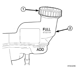 Master cylinder reservoirs (2) are marked, FULL and ADD, indicating the allowable brake fluid level range in the master cylinder fluid reservoir.