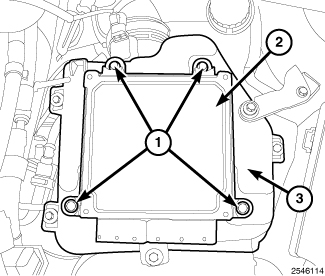 The Powertrain Control Module (PCM) is located in the left side of engine compartment and is attached to the top of air cleaner housing (2).