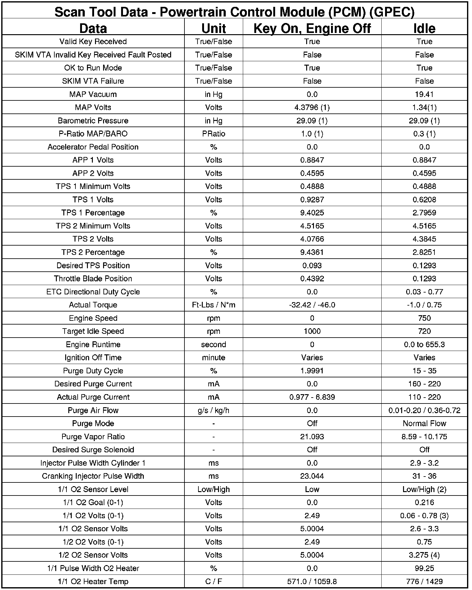 The following chart lists data values taken from the Scan Tool Powertrain Control Module (PCM) data list for the GPEC controller. The values were taken at key on, engine off and at idle. The data is to be used for reference only.