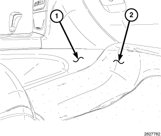 3. Fold the right side floor carpet (2) back under the center dash area.