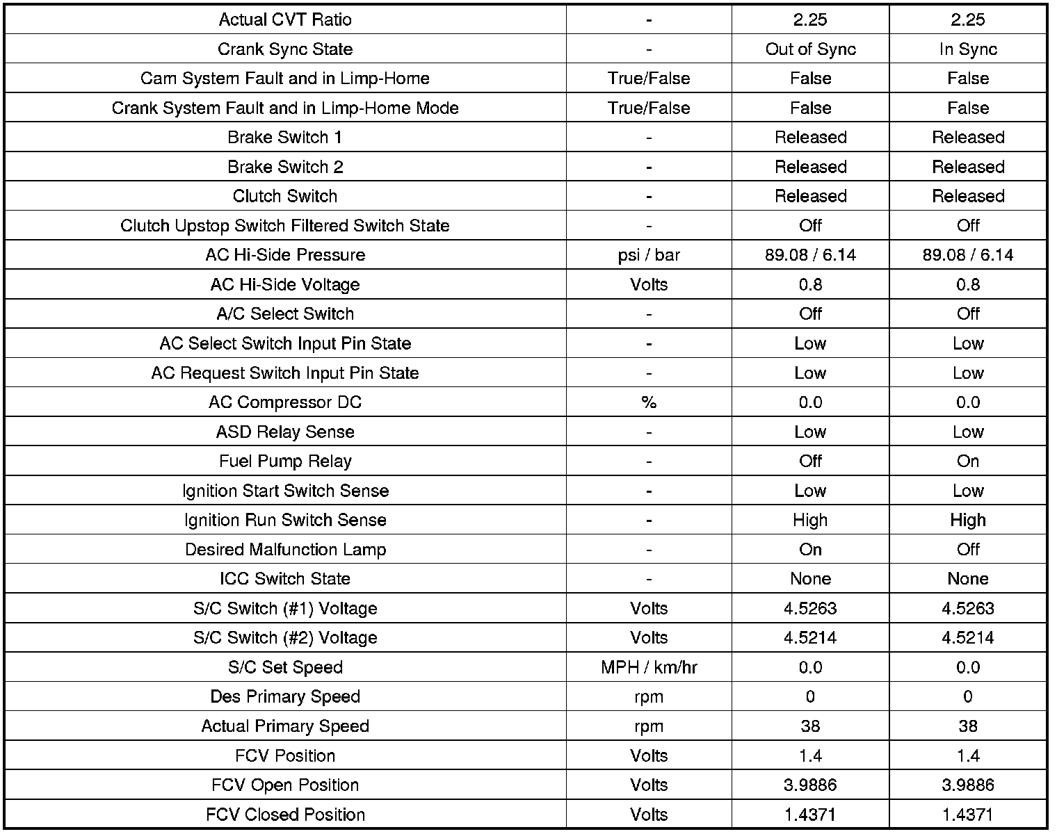 The following chart lists data values taken from the Scan Tool Powertrain Control Module (PCM) data list for the GPEC controller. The values were taken at key on, engine off and at idle. The data is to be used for reference only.