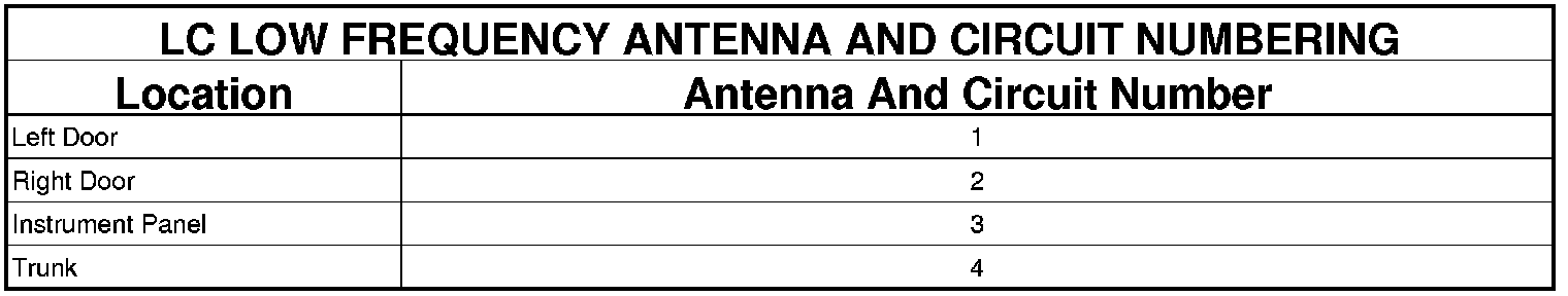 The number of antennas and the specific antenna locations are designed to ensure complete vehicle interior coverage. The LF antennas are each numbered and connected to the PEM on dedicated and sequentially numbered circuits. This arrangement allows the PEM to localize the positions of transmitting FOBIK units using a triangulation strategy. See the LC Low Frequency Antenna And Circuit Numbering table.