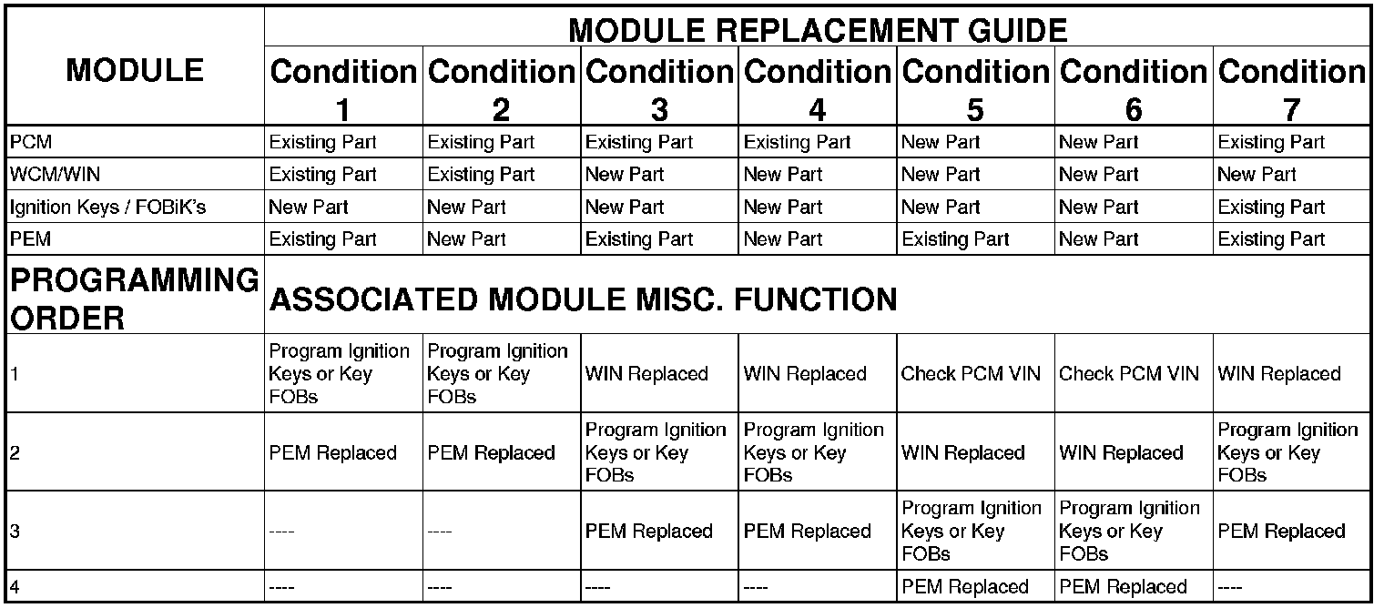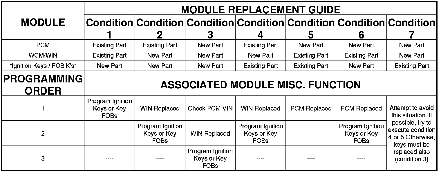 Match the module row with the condition that applies, after module replacement follow the chart down and program the modules in the chart order.