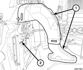 4. Connect the passenger side floor ducts (1) to the HVAC housing (2).