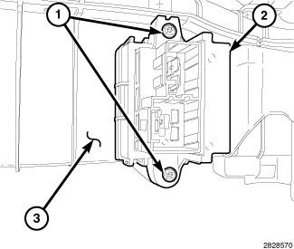 1. Position the blower motor power module (2) onto the HVAC housing (3).