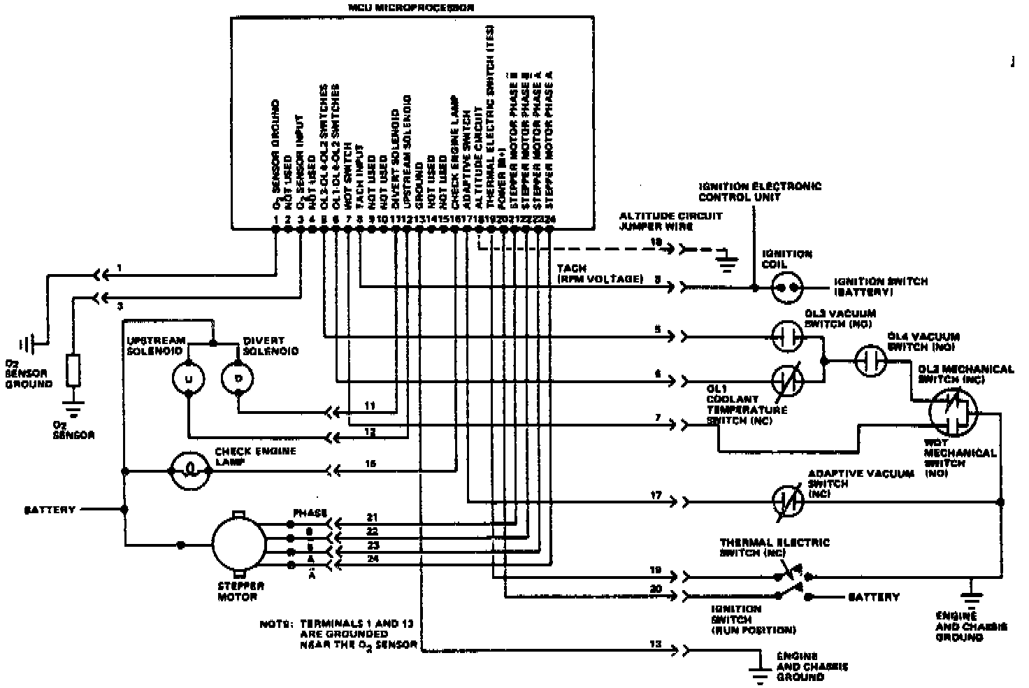 This unit is a microprocessor that monitors the oxygen sensor voltage and, based upon the mode of operation, generates an output control signal for the carburetor stepper motor.
