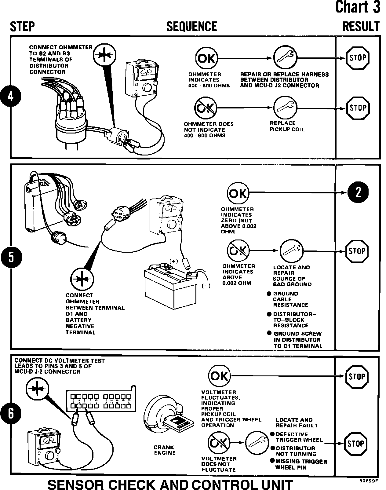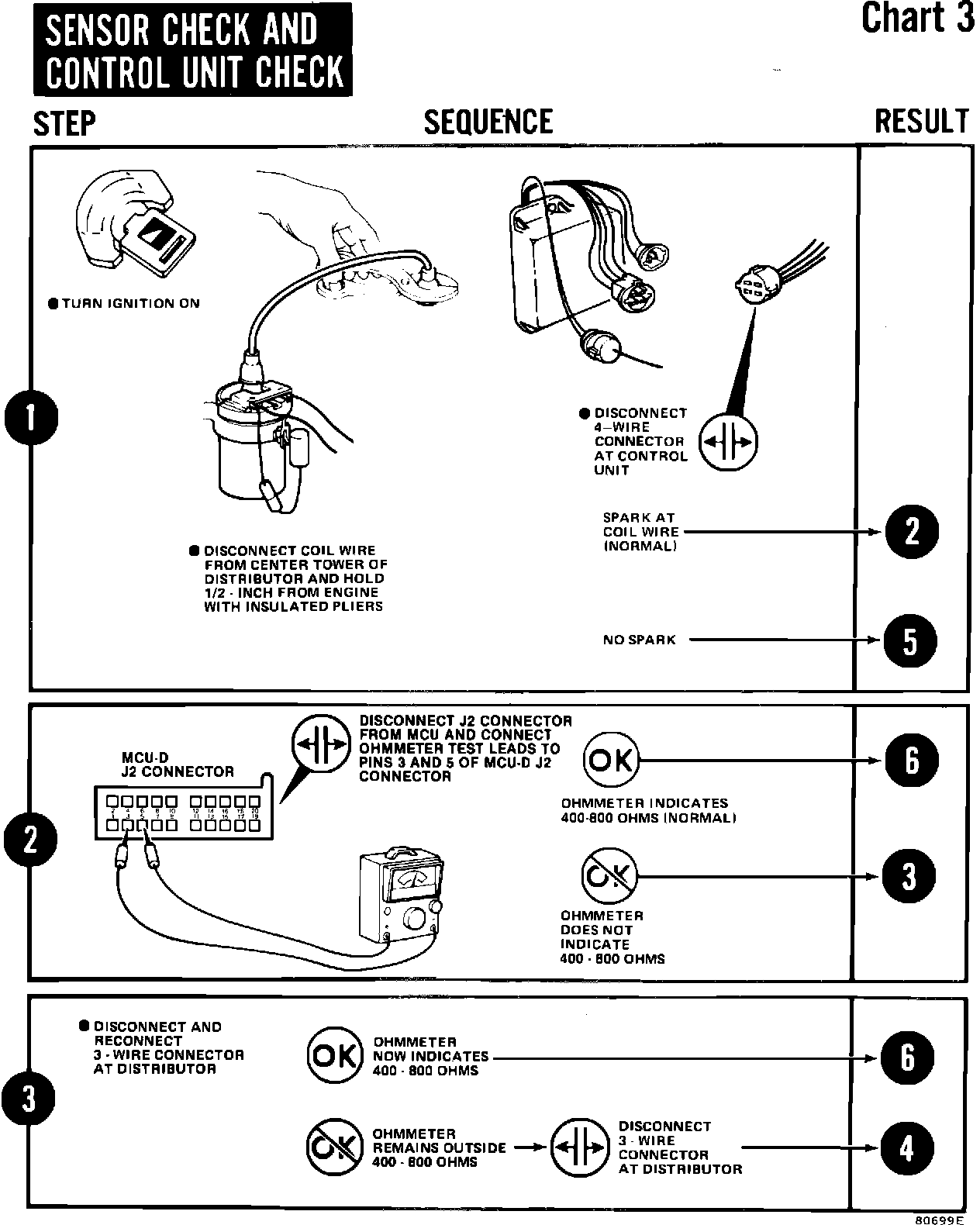 The Sensor Check and Control Unit Check diagnostic procedure, on pages 40 and 41 of Supplement No. 1 to the 1982 Jeep Technical Service Manual, are incorrect. Steps 2, 4 and 6 of this procedure have been revised to show the correct ohmmeter and voltmeter test probe test points required with the engine compartment wire harness connectors used in 1983 models.