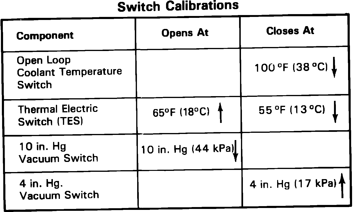 This mode of operation occurs when the engine is either at idle speed, accelerating from idle speed or decelerating to idle speed. If the engine RPM (tach) voltage is less than the calibrated value and manifold vacuum is above the calibrated switching level for the adaptive vacuum switch (switch open), an engine-from acceleration-from idle speed condition is assumed to exist. If the engine rpm (tach) signal is greater than the calibrated value and manifold vacuum is above the calibrated switching level of the adaptive vacuum switch (switch closed), an engine-deceleration-to-idle speed condition is assumed to exist. During the adaptive mode of operation, the MC solenoid provides a predetermined air/fuel mixture.