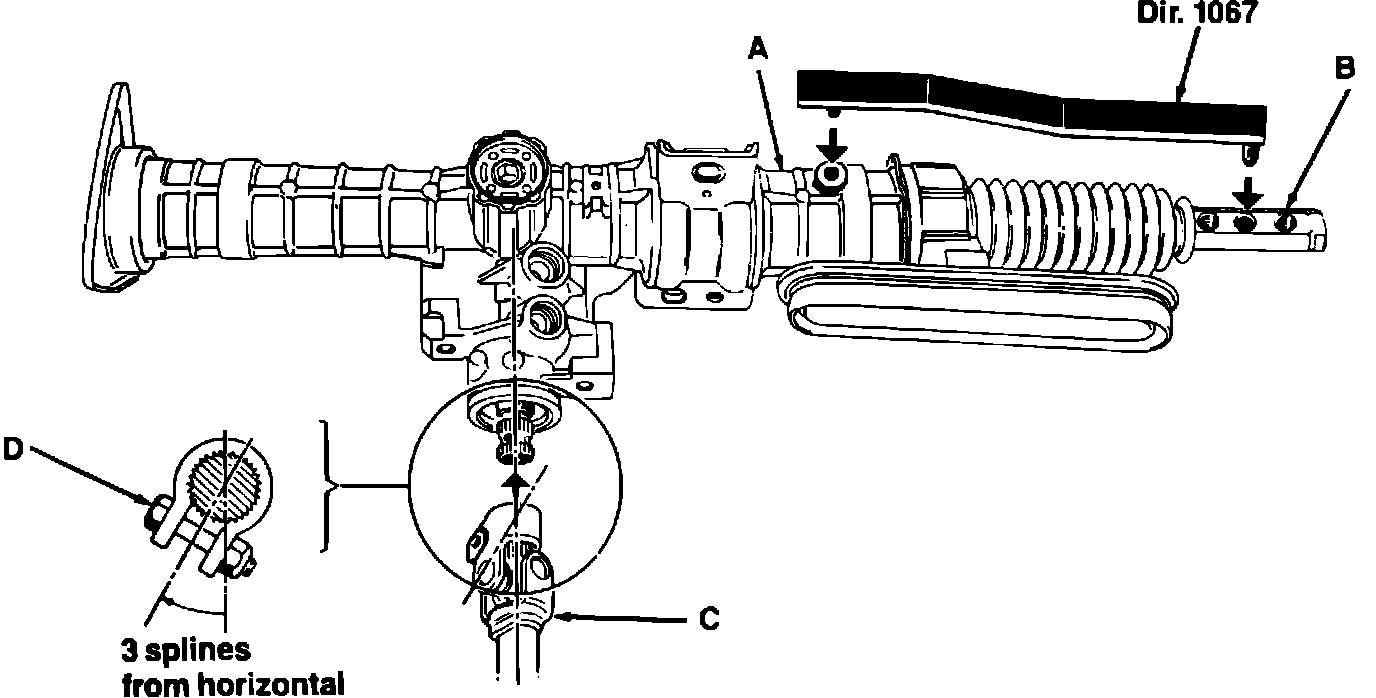 4. Check position of the steering shaft coupling (C). The coupling pinch bolt (D) must be located at the coupling underside and positioned 3 splines away from a horizontal position. Adjust coupling position, if necessary.