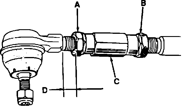1. Loosen tie rod locknut (A), and steering arm locknut (B). Locknut (A) has righthand threads. Locknut (B) has lefthand threads.