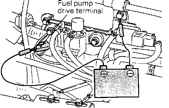 The fuel pump drive terminal (shown hooked-up) is located approx. center of the engine compartment on the firewall.