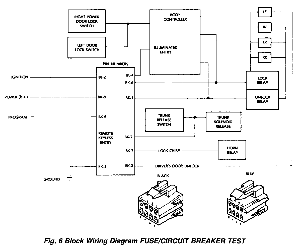 A blown fuse is the probable cause. The RKE battery circuit breaker is located in terminal 13, in the junction block. To check for a blown fuse, pull the fuse out slightly, but maintain contact between the fuse terminals and the terminals in fuse block. Using the voltmeter probe, check both terminals for 12 volts. If only one terminal measures battery voltage, the circuit breaker is defective and must be replaced. If neither terminal measures battery voltage, check for an open or shorted circuit to the junction box, repair as needed. If battery voltage is still not available, check the high current fuse J in the power distribution center, located in the engine compartment.