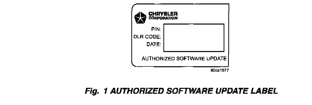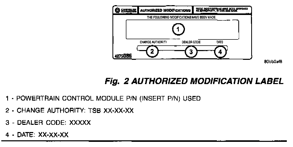 2. Type the necessary information on the Authorized Software Update Label p/n 04669020 (Fig. 1). Attach the label to the PCM and cover it with the clear plastic overlay. Type the necessary information on the Authorized Modification Label p/n 04275086 (Fig. 2) and attach the label near the VECI label.