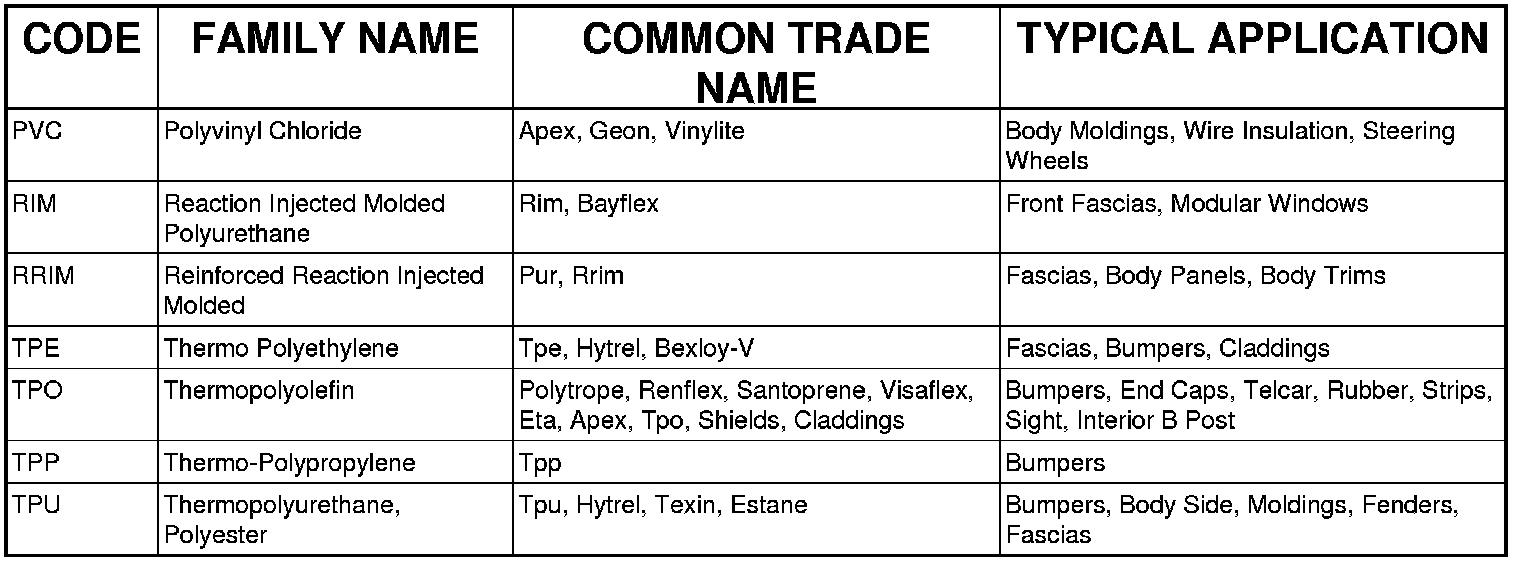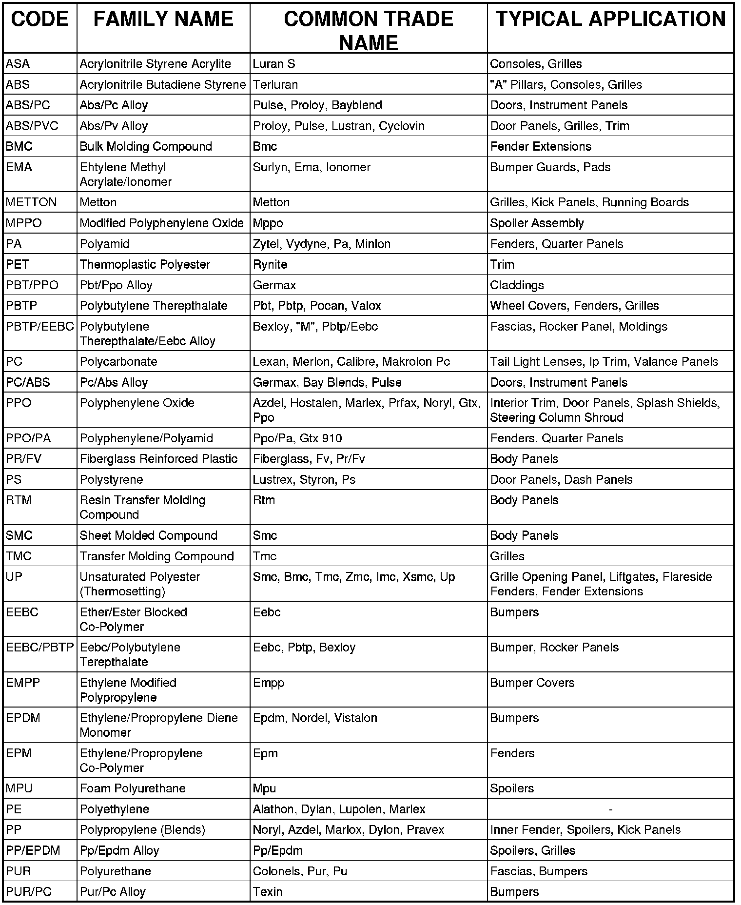 There are many different types of plastics used in today's automotive environment. We group plastics in three different categories: Rigid, Semi-Rigid, and Flexible. Any of these plastics may require the use of an adhesion promoter for repair. These types of plastic are used extensively on Chrysler vehicles. Always follow repair material manufacturer's plastic identification and repair procedures.