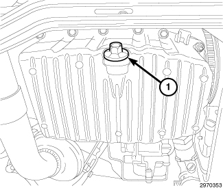 8. Remove the drain plug (1) from oil pan and allow the oil to drain into the pan. Inspect the drain plug threads for stretching or other damage. Replace the drain plug and gasket if damaged.